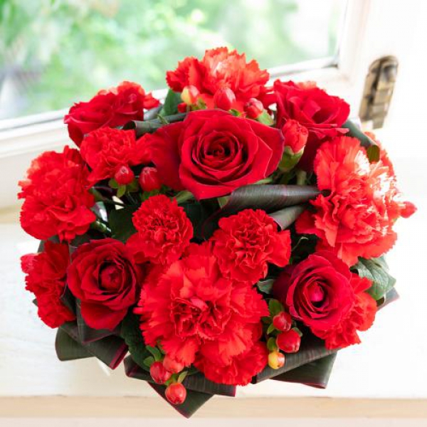 赤系のバラやカーネーションをメインですのでお祝いにぴったりです。