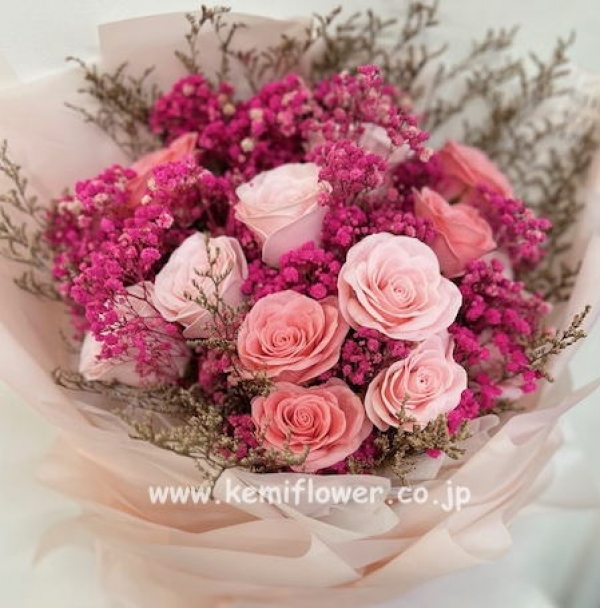 薔薇をソープフラワーでカスミ草はプリザーブドフラワーで制作されてます。