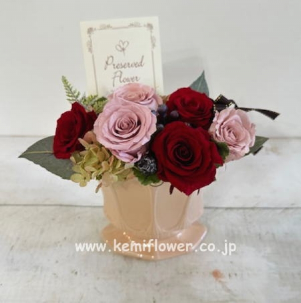 赤・ピンク系でシックなプリザーブドフラワーです。